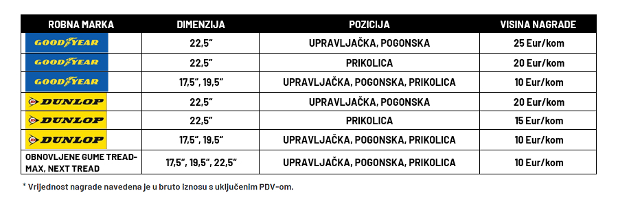 Kupnja odabranih novih cestovnih (OnRoad) teretnih guma za upravljačku i pogonsku osovinu te prikolicu robne marke Goodyear i Dunlop veličine 17,5", 19,5", 22,5" te kupnju obnovljenih guma u periodu od 17. 3. do 17. 5. 2025. (PRODUŽENO DO 20.06.2025.) donosi vam dodatne pogodnosti: