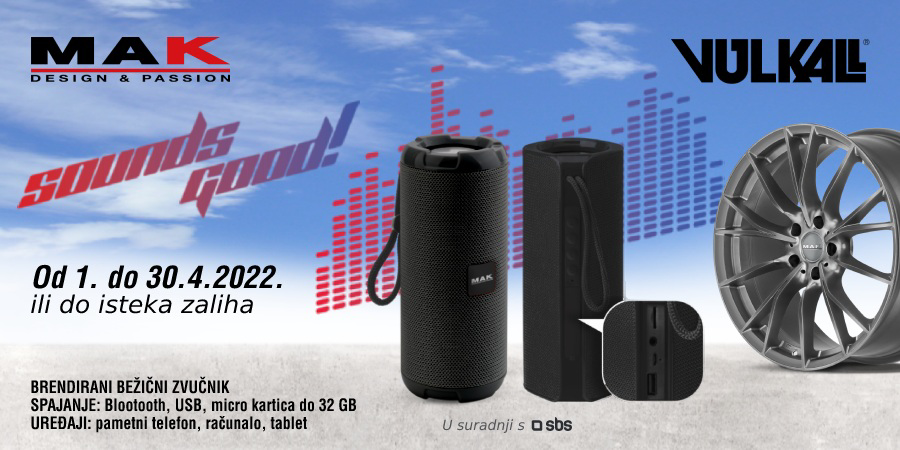 Uz kupnju 4 MAK naplatka 18'' i veće, u periodu od 1. do 30.4.2022. (ili do isteka zaliha) poklanjamo vam moderan, prijenosni SBS zvučnik! Jednostavno ga spojite sa svojim pametnim telefonom, a sadrži i USB ulaz te mjesto za micro karticu. Zvučnik projicira kristalno čist zvuk, s izvanrednom dubinom basova i gotovo četiri sata neprekidnog rada. Na sebi ima integrirani remen pa ga lako možete pričvrstiti za ruksak ili objesiti na granu.