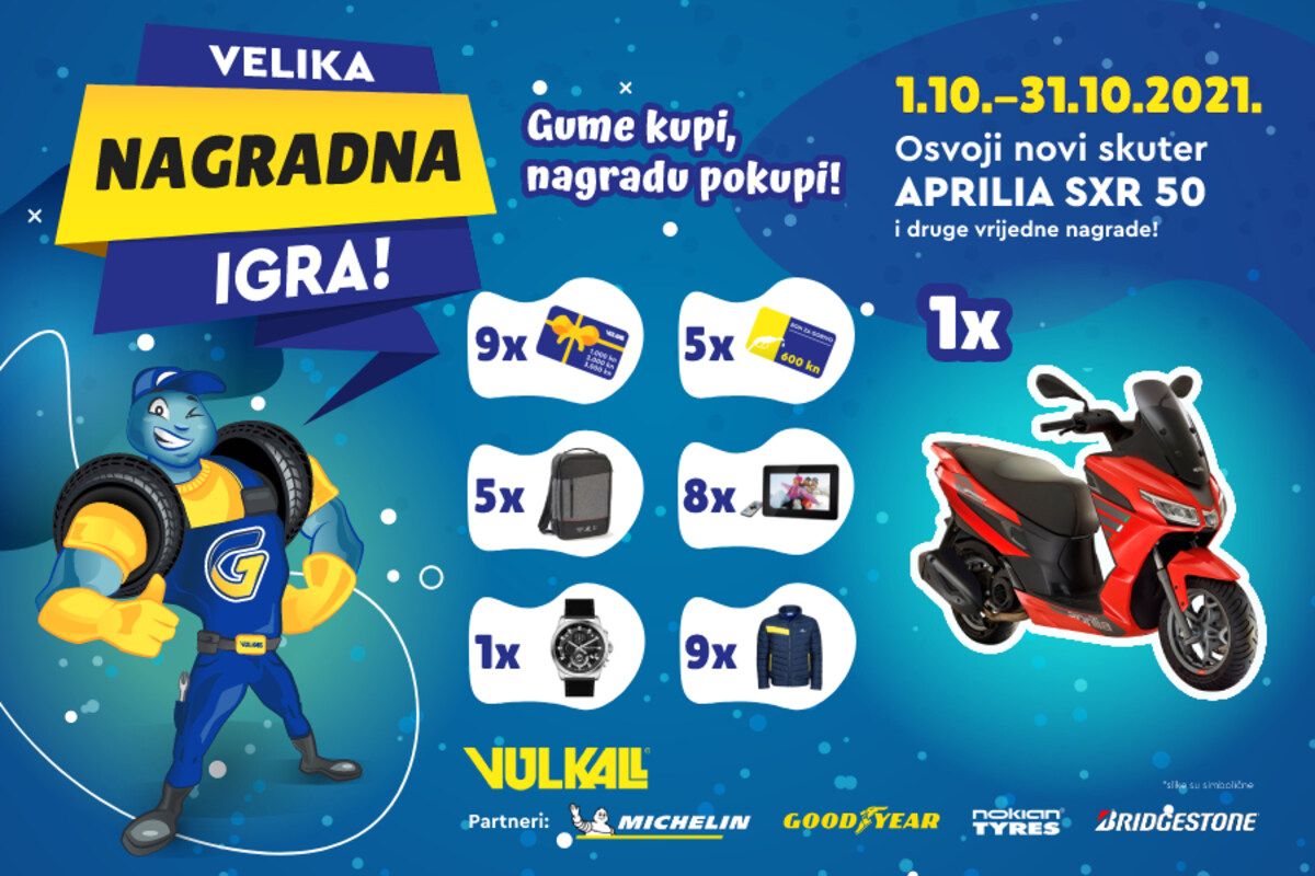 Od 1. do 31.10.2021.uz svakih potrošenih 300,00 i više kuna na jednom računu, za usluge brzih servisa ili kupnju novih guma, ostvarujete pravo sudjelovanja u nagradnoj igri.