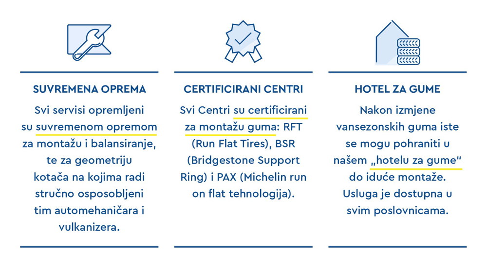 Raspolažemo s 10 prodajno-servisnih centara: tri u Zagrebu (uz Outlet guma), dva u Rijeci i po jedan u Velikoj Gorici, Zadru, Stankovcima te Osijeku.