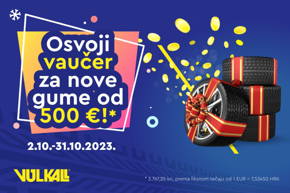 Svim vozačima i vlasnicima putničkih i SUV automobila, koji tijekom listopada 2023. godine obave kupnju dva ili četiri pneumatika iz Vulkalove zimske, ljetne ili cjelogodišnje ponude, nudimo priliku za osvajanje vaučera za gume u iznosu od 500,00 eura (3.767,25 kn, prema fiksnom tečaju konverzije 1 EUR = 7,53450 HRK)!