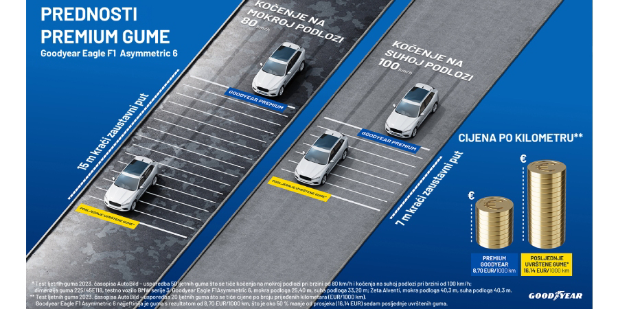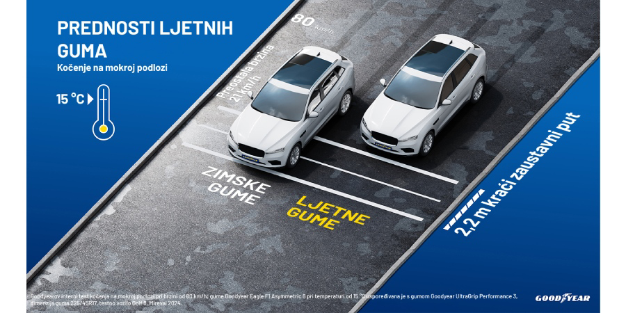 S porastom proljetnih temperatura Goodyear svim vozačima preporučuje prelazak na ljetnu opremu. Odabir pravih guma ključan je i zbog zaustavnog puta koji na mokroj cesti pri brzini od 80 km/h može biti duži do 15 metara, a pri brzini od 100 km/h na suhoj cesti 7 metara.1