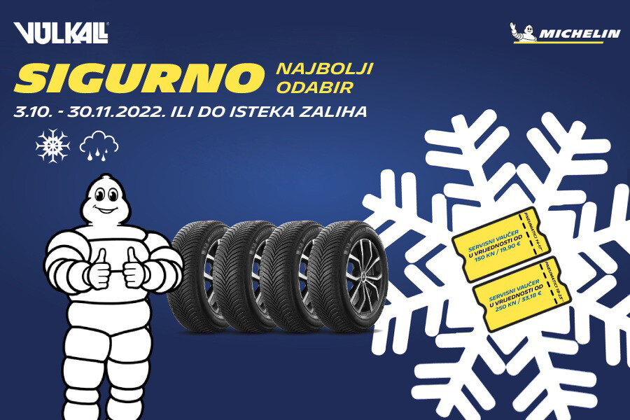 Ako u periodu od 3. listopada do, zaključno, 30. studenog 2022. (ili do isteka zaliha) u bilo kojoj Vulkalovoj poslovnici kupite četiri nova Michelin pneumatika iz zimskog i cjelogodišnjeg programa, ostvarujete pravo na značajnu uštedu pri montaži istih: