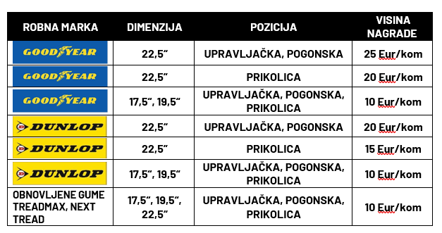 Tijekom travnja i svibnja 2024. (produženo i na lipanj 2024.) Goodyear nagrađuje prijevoznike za kupnju odabranih, novih cestovnih teretnih guma za upravljačku i pogonsku osovinu te prikolicu robne marke Goodyear i Dunlop veličine 17,5", 19,5", 22,5" te za kupnju obnovljenih guma, kako je vidljivo iz tablice: