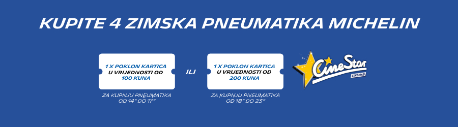 Ne propustite veliku sezonsku promociju u svim Vulkalovim poslovnicama jer u periodu od 21. rujna do 31. prosinca 2020. (ili isteka zaliha) pri kupnji četiri MICHELIN zimske gume, uključujući i pneumatike MICHELIN CrossClimate do 17 cola, darujemo CINESTAR poklon karticu u vrijednosti od 100,00 kn, a pri kupnji MICHELIN guma od 18'' na više, dobivate CINESTAR poklon karticu u vrijednosti od 200,00 kn!